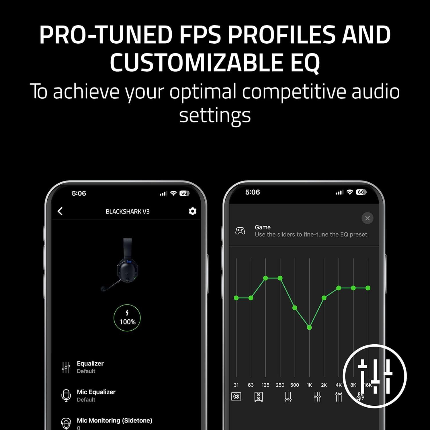 PRO-TUNED FPS PROFILES AND CUSTOMIZABLE EQ — Unlock an audio advantage with game-specific EQ profiles, precision-tuned with Razer's roster of esports champions; create custom EQs, save it to the headset, and be ready to compete anytime